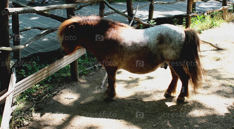 Пони бело-коричневой масти стоит у забора в зоопарке