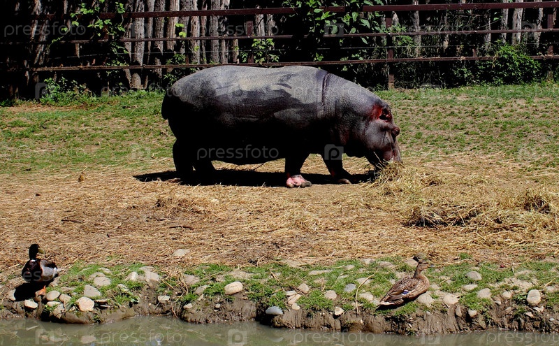 Бегемот кушает сено в загоне зоопарка солнечным днем