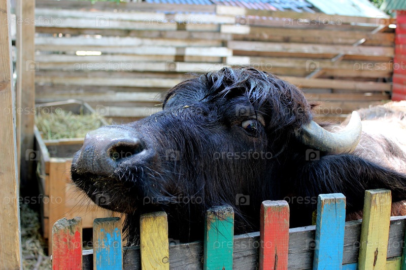 Морда африканского кафрского буйвола появилась из-за забора зоопарка