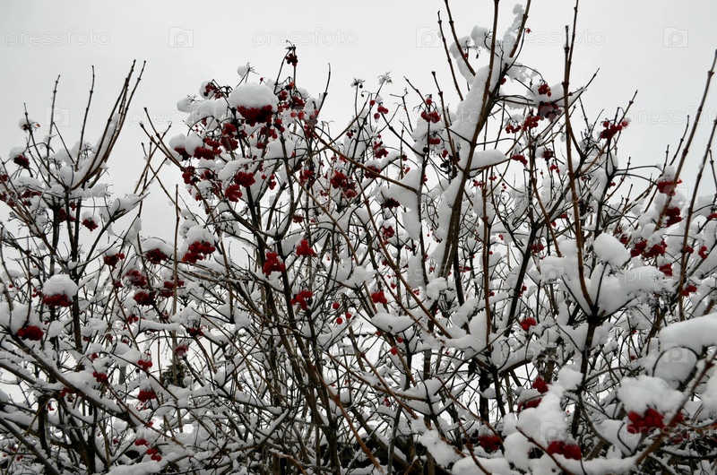 Заснеженный пейзаж. Куст калины с красными ягодами под снегом