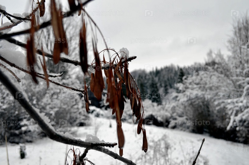 Заснеженный пейзаж. Семянки ясеня на переднем плане