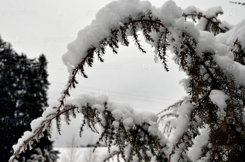 Заснеженные ветки можжевельника крупным планом