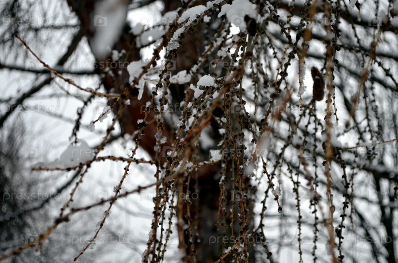Заснеженные ветки лиственницы крупным планом