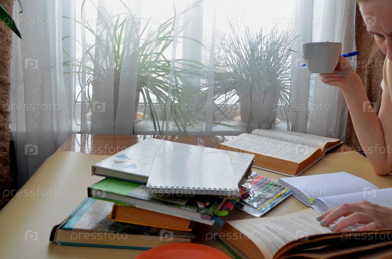 Концепция многозадачности: студент одновременно читает, пишет и пьет кофе
