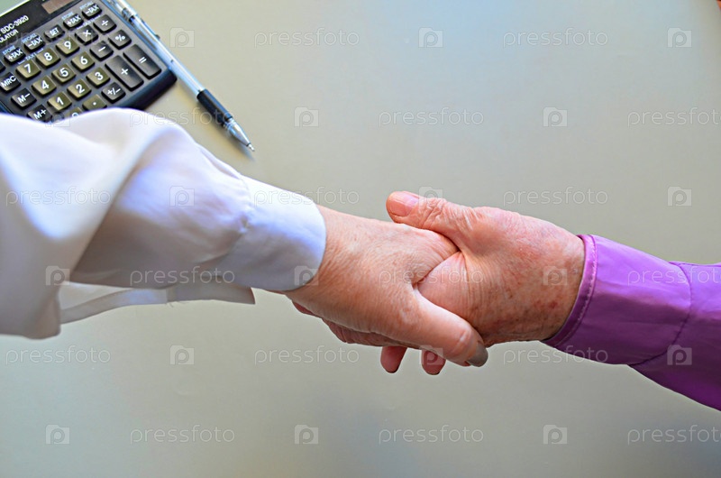 Деловое рукопожатие на фоне калькулятора, авторучки