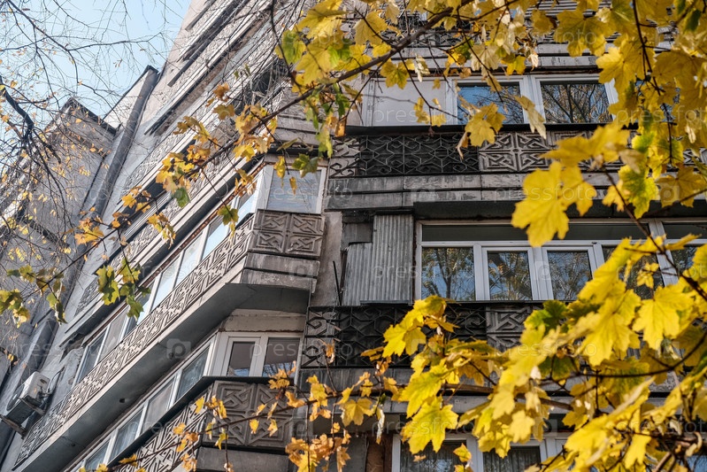 Фасад дома в стиле советского модернизма через осенние листья