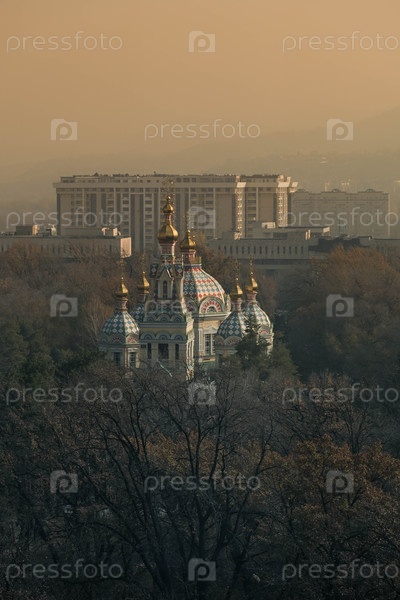 Вид на Вознесенский кафедральный собор в Алматы, на фоне горы