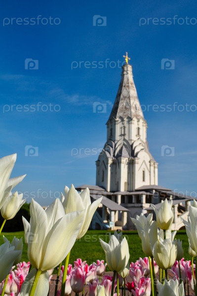 Весна в Коломенском: церковь Вознесения в тюльпанах