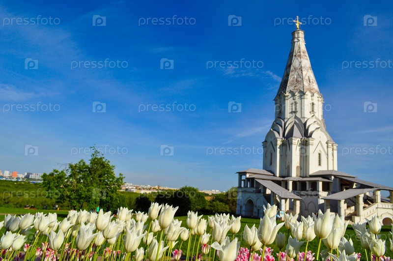Весна в Коломенском: церковь Вознесения в тюльпанах