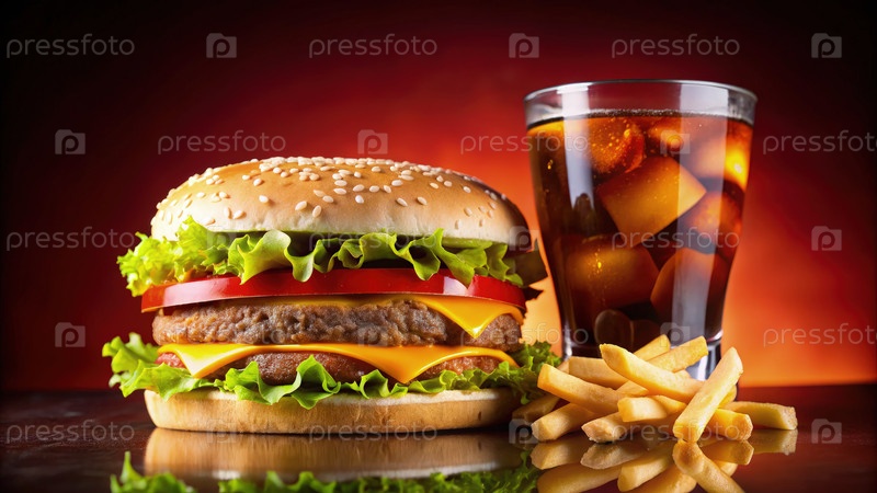 Сочный бургер подается с хрустящими картофелями и освежающим напитком на закате