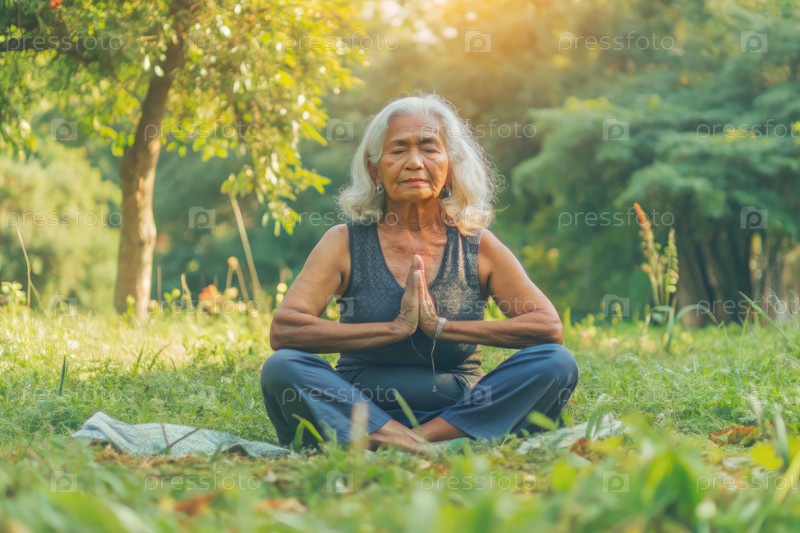 Пожилая женщина практикует йогу в спокойной обстановке на свежем воздухе во время заката