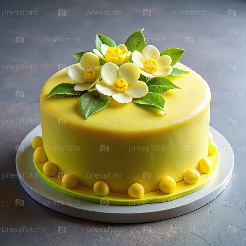 Пирог с лимонным фанантом, украшенный цветами на светло-сером фоне