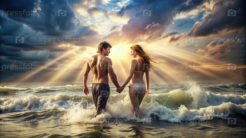 Молодая пара наслаждается прогулкой на закате в океанических волнах