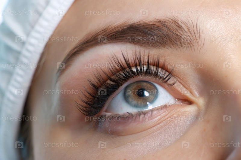 Близкий взгляд на человеческий глаз с расширениями ресниц во время косметической процедуры