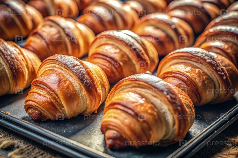 Свежевыпеченные кроассанты охлаждаются на пекарном листе в теплой кухне