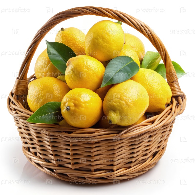 Зрелые лимоны в плетеновой корзине на белом фоне