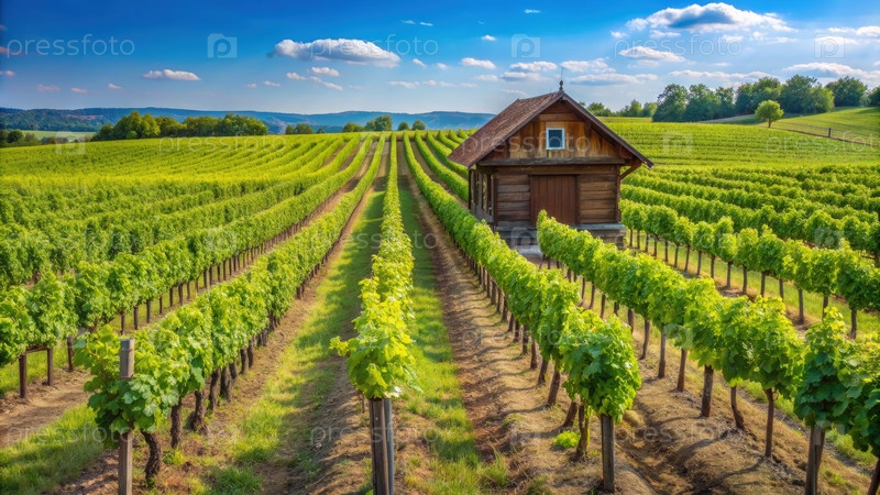 Расширенное молодое виноградное поле с очаровательным деревянным домом под ярким голубым небом