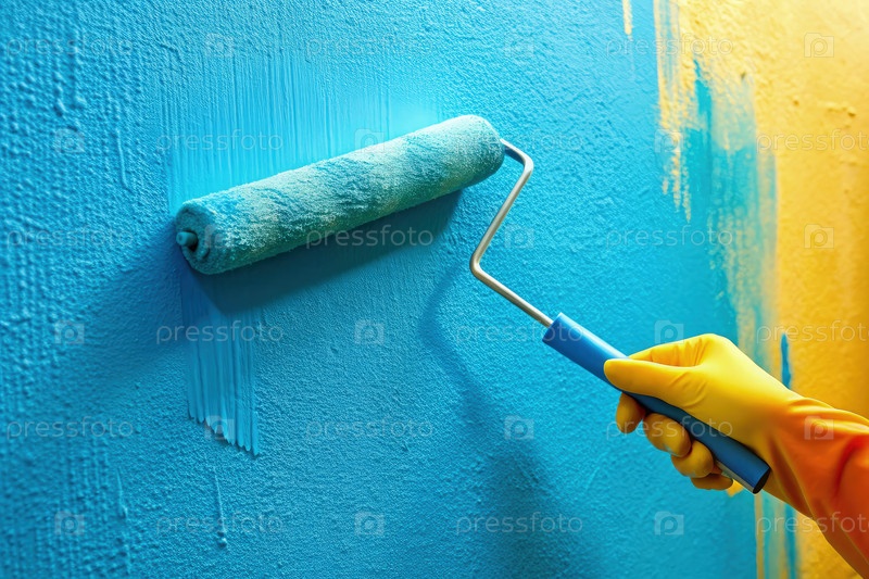 Нанесение синей краски на текстурированную стену с помощью ролика в ярком рабочем пространстве