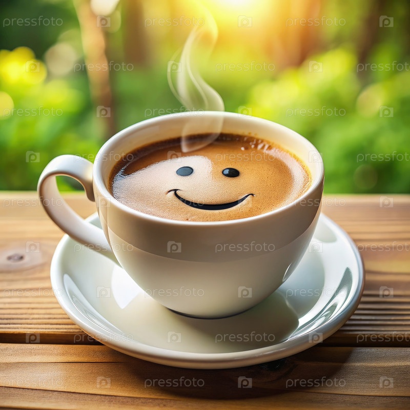 Счастливая чашка кофе, испаряющаяся в утреннем свете на деревянном столе
