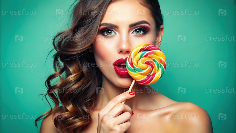 Молтина Франко наслаждается красочным леденец на ярком фоне
