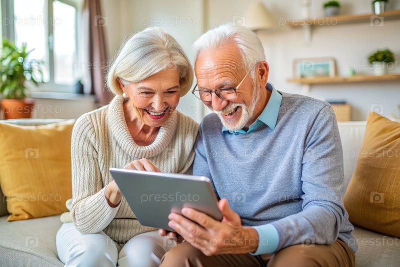 Пожилая пара наслаждается учебным занятием по новым приложениям дома в уютной гостиной