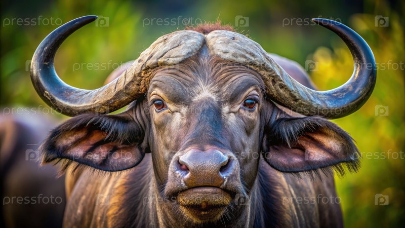 Бизон смотрит прямо на камеру среди пышной зелени, демонстрируя свои впечатляющие рога и выразительные черты во время золотого часа