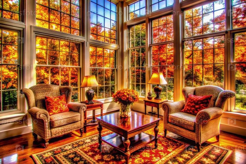 Уютная гостиная с большими окнами, демонстрирующими яркие осенние деревья