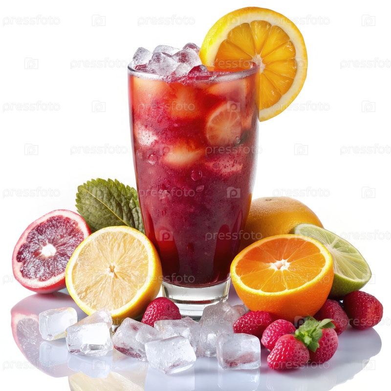 Освежающий фруктовый сок с льдом и ломтиками в ярко освещенной летней обстановке