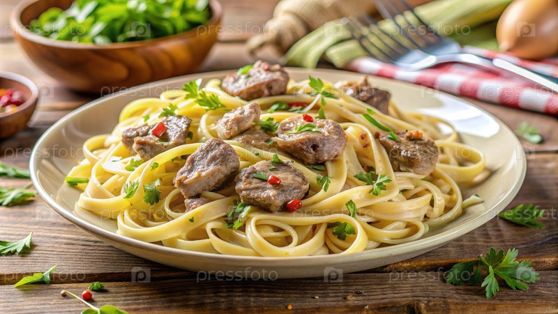 Сладкие лингвиновые макароны, покрытые нежной жареной куриной печенью и травами