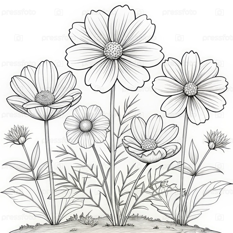 Detailed Coloring Page Featuring Cosmos Flowers in a Plant Bed Surrounded by Lush Leafage (Детальная красочная страница с цветами космоса в растительном поле, окруженном пышными листьями)