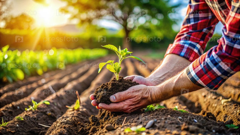 Фермер изучает состояние почвы во время посадки молодой культуры на закате