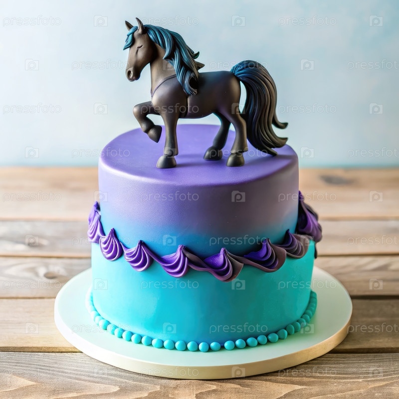 Красивый черно-голубой фиолетовый торт, увенчанный любимой лошадью