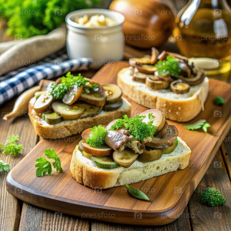 Вкусные бутерброды с грибами и огурцами на деревянном столе