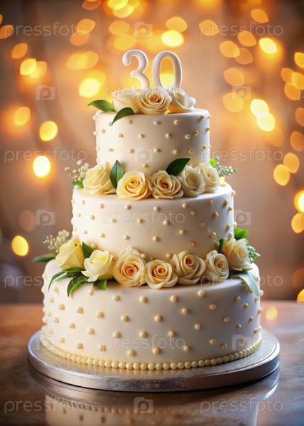 Элегантный трехуровневый годовщину свадьбы торт украшен желтыми розами и искрящимися огнями, отмечая 30 лет любви и единства