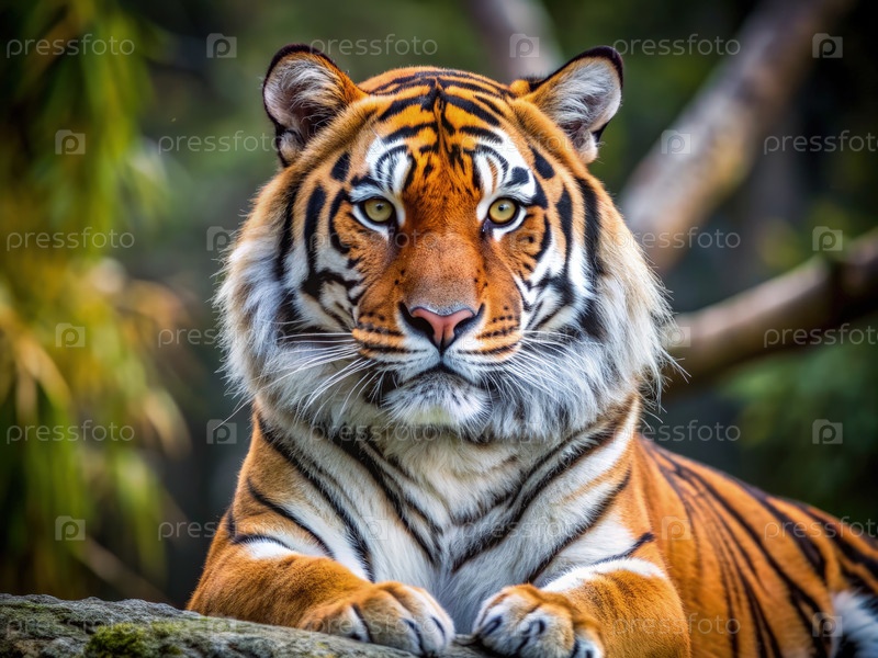 Величественный тигр, отдыхающий на скале в пышном лесу во время золотого часа