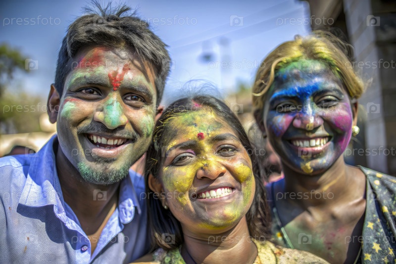 Счастливый индийский народ празднует фестиваль с яркими цветами во время Холи
