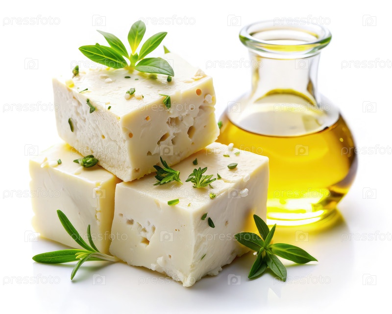 Кубики с сыром Feta, украшенные травами и близлежащим оливковым маслом