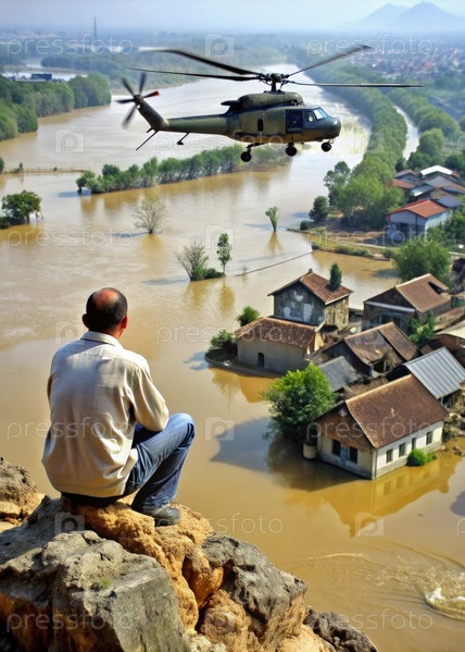 Человек наблюдает за спасательными работами вертолета с неровной скалы во время наводнения