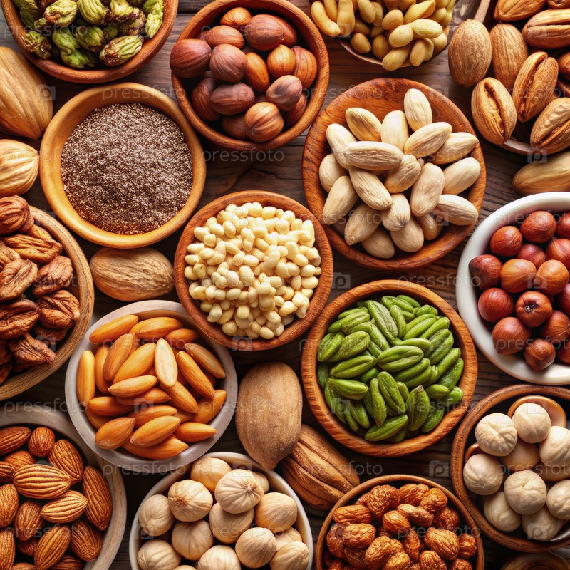 Разнообразные орехи и семена, расположенные в мисках на деревянной поверхности