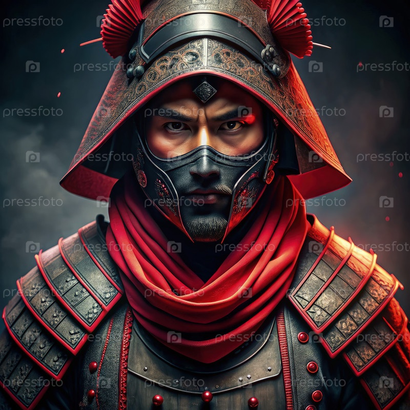 Ожесточенный самурай, одетый в красно-черную доспехи, готовится к битве