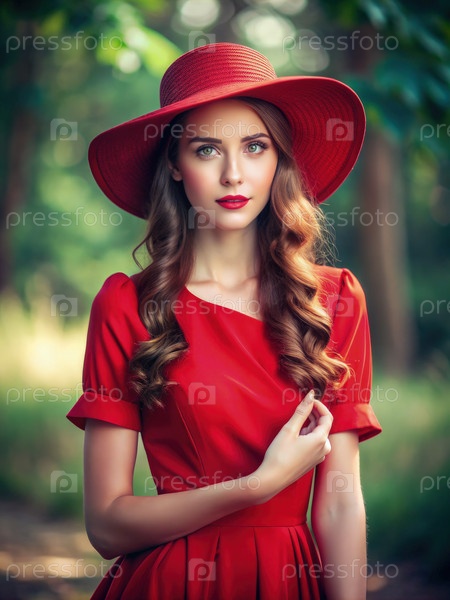 Молодая леди в красном платье и широкой шляпе элегантно позирует в лесной обстановке