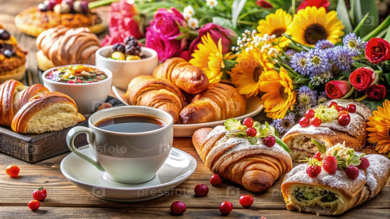 Живая настройка завтрака с разнообразными выпечками и свежими цветами в утреннем свете
