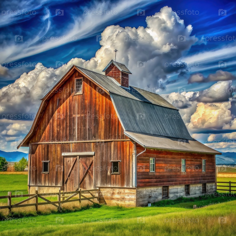 Рустичный амбар под ярким небом в сельском пейзаже днем