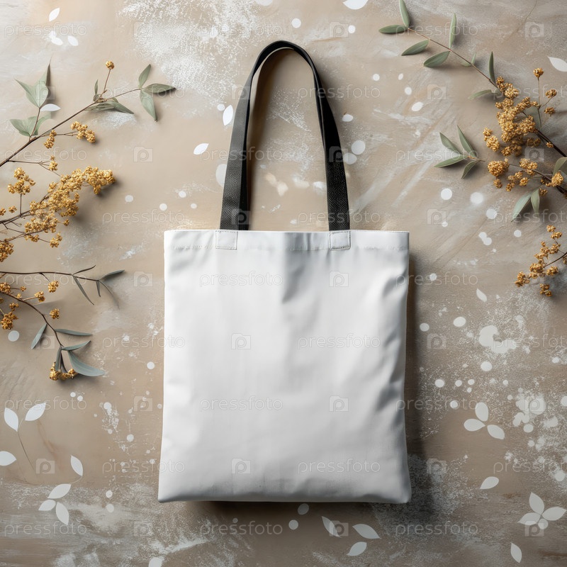 Стильный белый макет сумки с черными ручками на мягком фоне, окруженный природными элементами