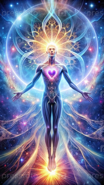 Мистическая фигура, излучающая энергию в космической обстановке во время момента духовного пробуждения