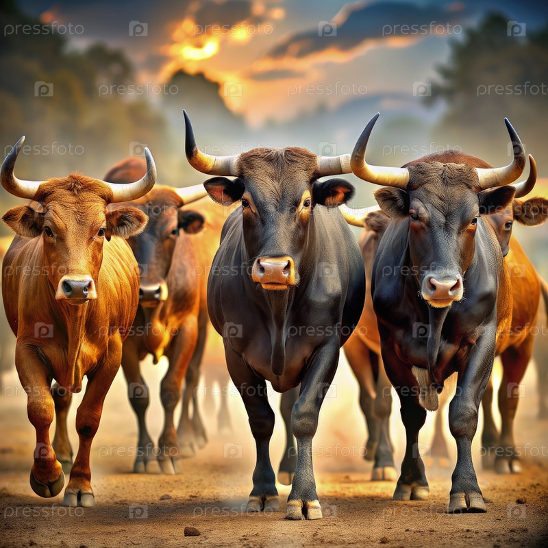 Стадо крупного рогатого скота, идущего по пыльному поле под ярким закатом солнца, изображает сельскую жизнь и красоту природы в вечернем свете