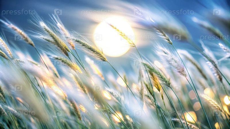 Золотой лунный свет блестит сквозь раскачивающиеся травы на закате