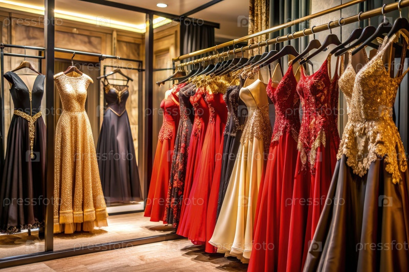 Роскошный бутик, демонстрирующий элегантные вечерние платья в богатых красных тонах на стильном месте