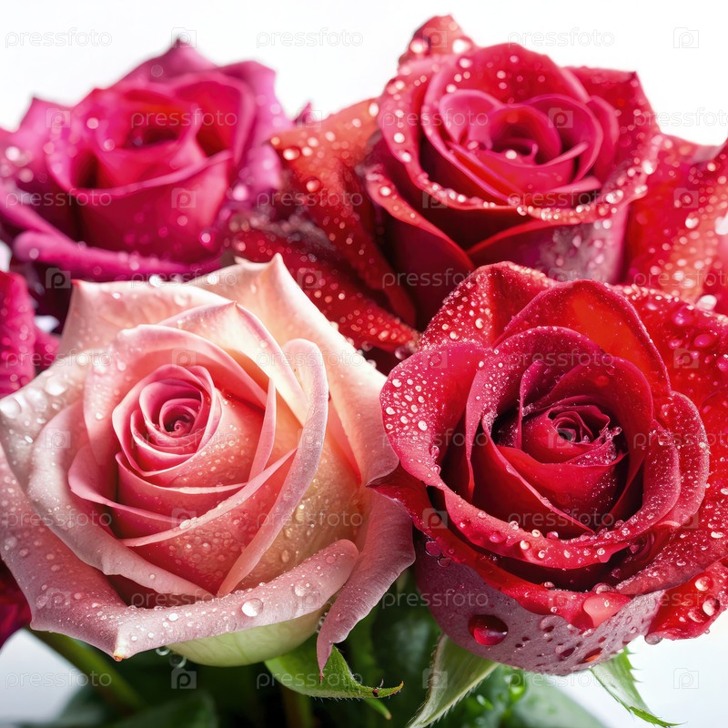 Красные и розовые розы с каплями воды, изолированными на белом фоне