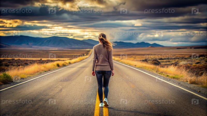 Женщина, идущая одна по безлюдной дороге во время драматического заката солнца